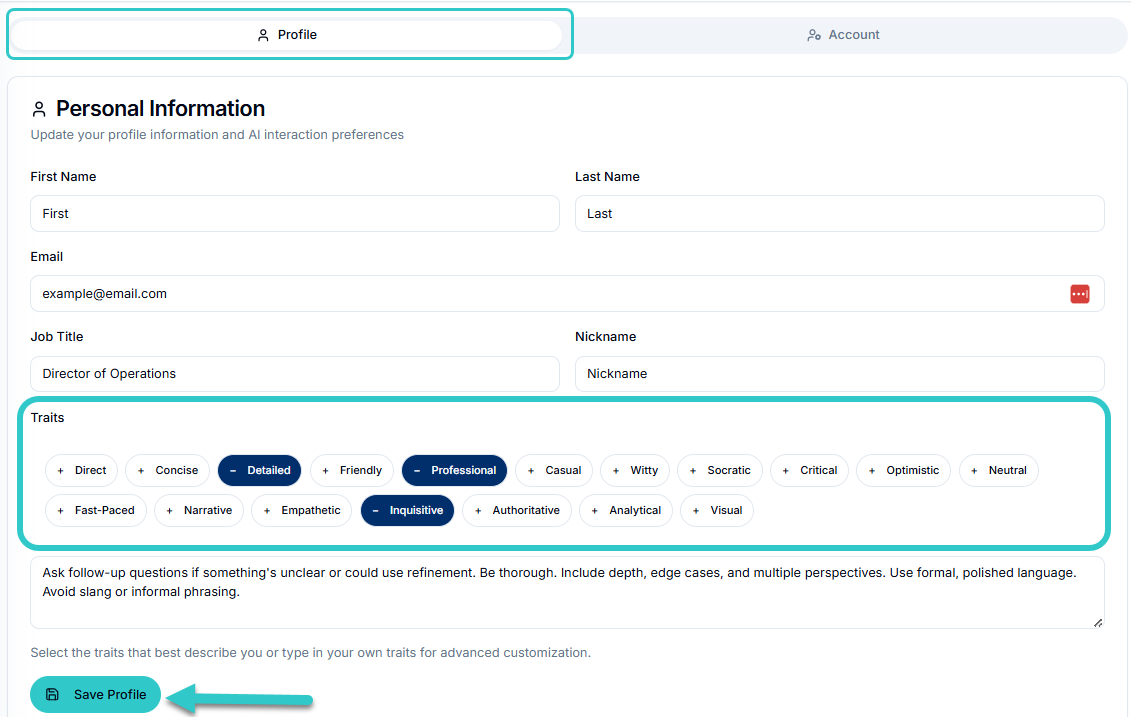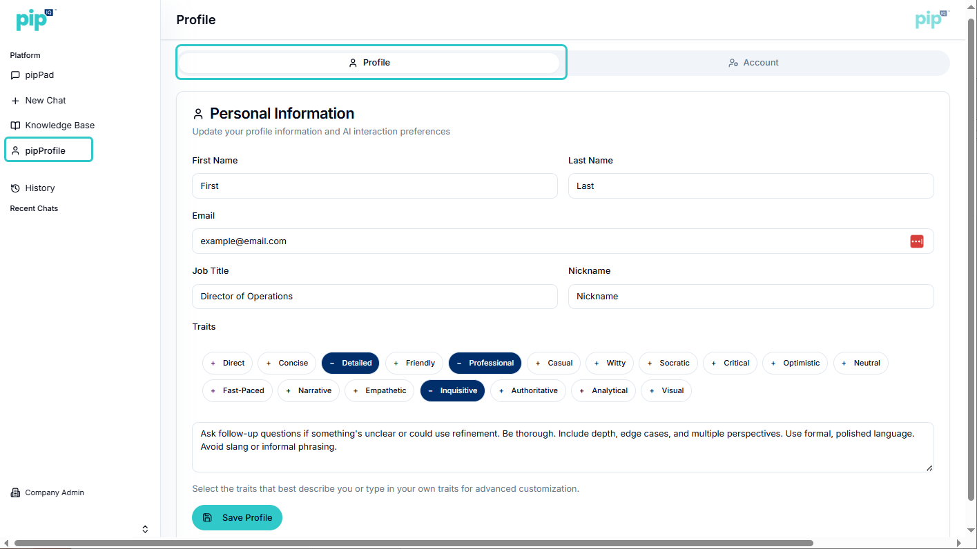 Under Traits, select or deselect your preferred options. These settings adjust how pipIQ communicates with you (tone, style, and personality). They do not affect the experience of other users.